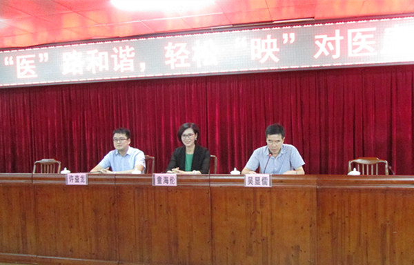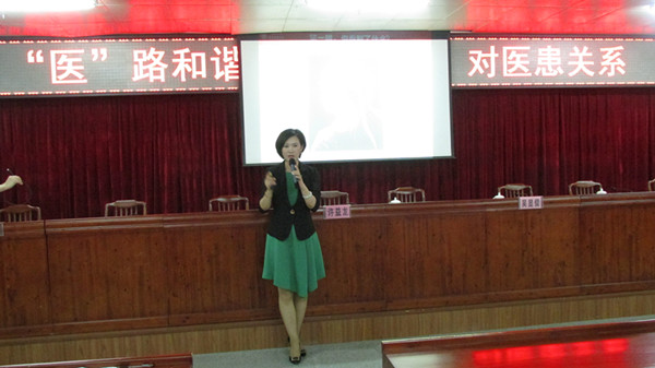 10月12日下午,我院内科楼十三楼会议室传出潮水般的掌声,我院特别邀请到了上海交通大学海外教育学院的童海伦教授、江苏恒瑞医药股份有限公司许益龙总经理为全院员工作以《“医”路和谐,轻松“映”对医患关系》为主题的讲座。讲座由我院医纠办李民主任主持,吴显儒副院长作了总动员,全院300多名员工参加了讲座培训。