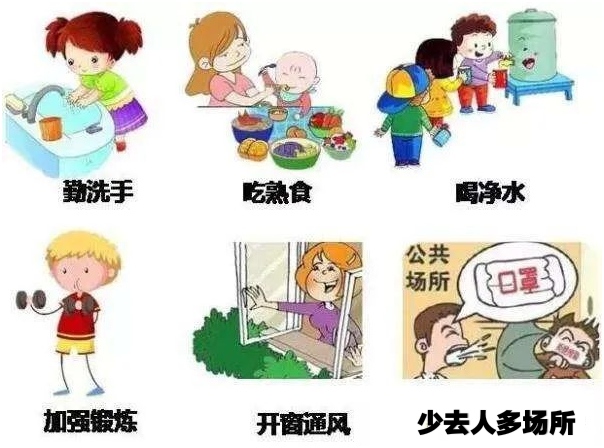 1.饭前便后、外出后要用肥皂或洗手液等给儿童洗手,不要让儿童喝生水、吃生冷食物,避免接触患病儿童。
