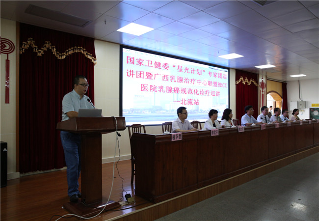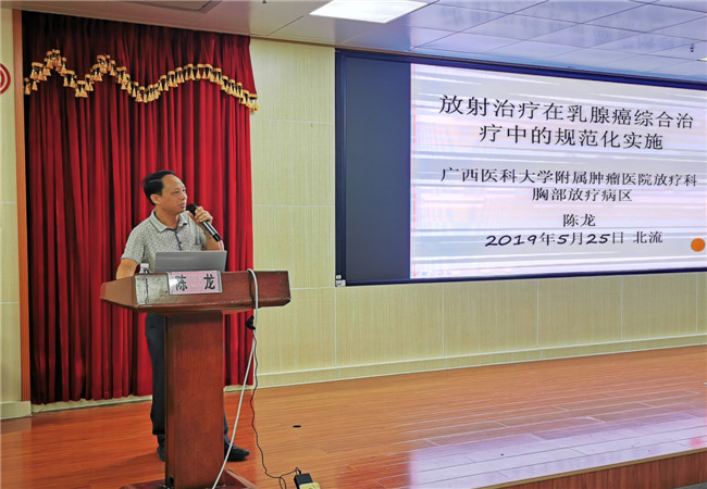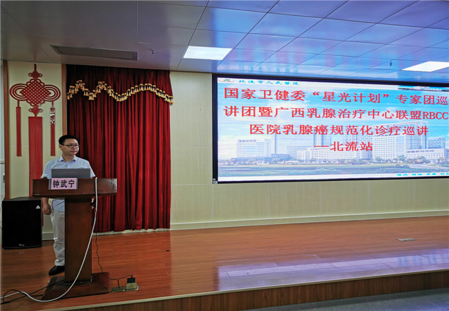 为了进一步提高本地区乳腺癌的规范化治疗水平,提高本地区医务人员乳腺癌的诊治水平,提高乳腺癌患者的生存质量,我院于5月25日在内科楼13楼会议室举办了自治区级继续医学教育项目《乳腺癌的全程管理及精准治疗学习班》、国家卫健委“星光计划”专家团巡讲暨广西乳腺治疗中心联盟RBCC医院乳腺癌规范化诊疗巡讲(北流站)》学习班,我们邀请到了广西医科大学附属肿瘤医院莫钦国、陆永奎、陈龙3位教授为本次学习班授课,并邀请广西医科大学附属肿瘤医院赖少侣主任医师、钟武宁博士作为乳腺癌MDT病例讨论嘉宾,院内、外近300多名学员参加了此次学习。