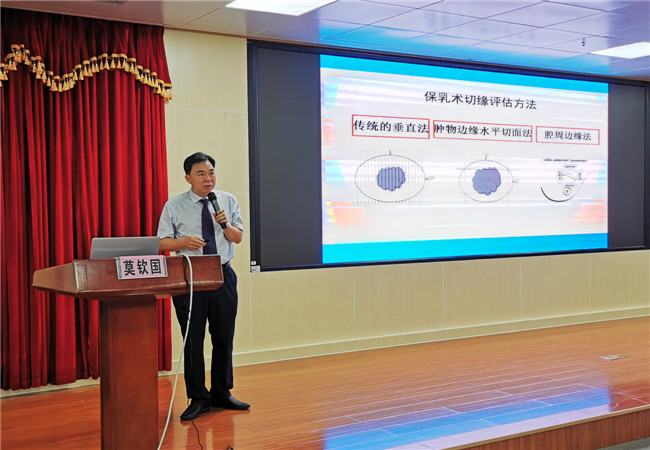 学习班首先由广西医科大学附属肿瘤医院乳腺外科莫钦国教授给我们进行授课,授课内容是《乳腺癌保乳术的外科质量控制》,风趣幽默的莫钦国教授授课方式灵活多样,通过引用典型的小视频案例和具体生动的事例,突出重点、条理清晰、透彻讲解乳腺癌保乳术,让学员们直观地看到乳腺癌保乳术创伤小,恢复快,可以保留乳房形态,病人心理接受度高,术后对正常生活影响较小的优点,还提出了许多帮助学员掌握操作思路的方法和技巧,让在场在学员们对乳腺癌症状的识别、诊治有了更深的认识,引来会场阵阵掌声。