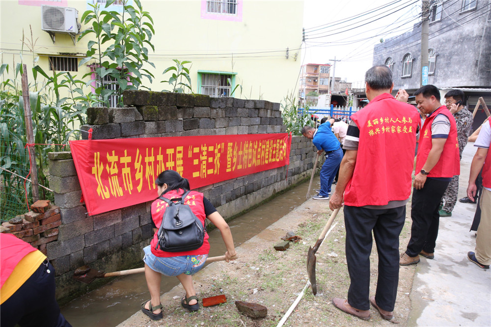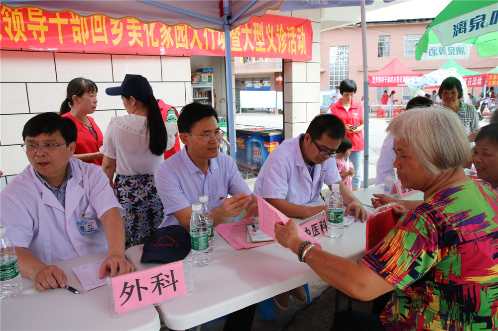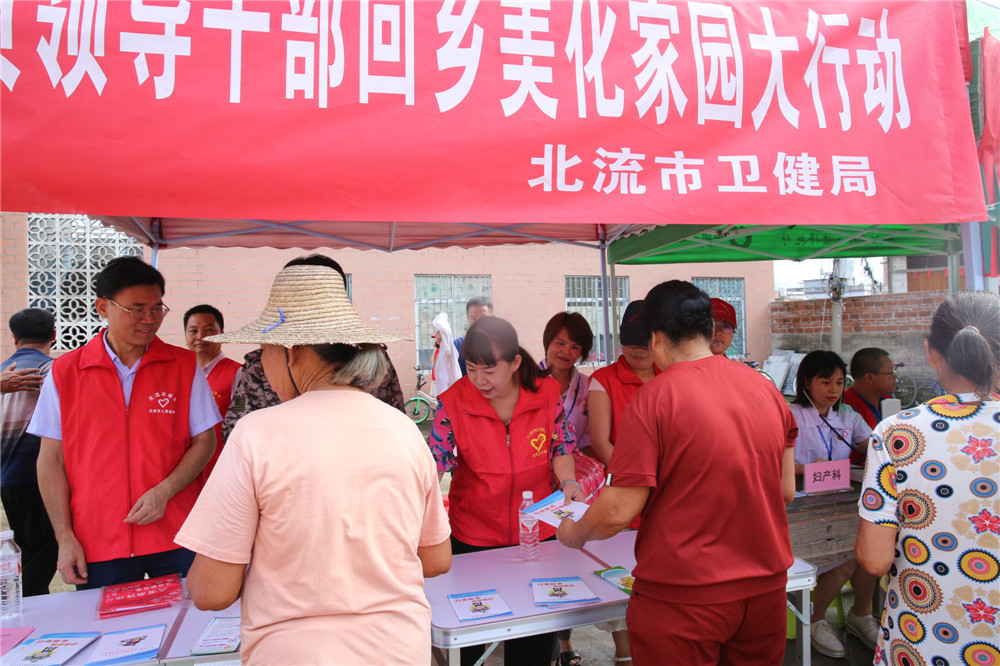 为响应北流市领导干部回乡美化家园行动号召,6月6上午,根据市卫健局的统一部署,我院党委书记李才、纪委书记吴雪梅(原籍:新圩镇河村)、护士长张凤娟(原籍:新圩镇河村)带队到新圩镇河村开展了党员领导干部回乡美化家园大行动暨大型义诊活动。通过发挥原籍领导干部先锋模范带头作用,以实际行动,提高群众的预防保健意识,促进群众健康提升、深入推进乡村风貌和助力乡村振兴。