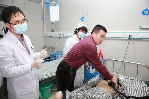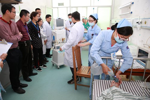 15点,根据应急演练方案,以呼吸内科为模拟演练现场,病房内突发一名心律失常患者需要使用除颤仪进行抢救,急需从心血管内科调配一台除颤仪使用。恰巧在演练结束的同时,病房内一病人出现呼吸心跳骤停,在场的吴显儒常务副院长、梁燕芳副院长立即率领医务部植华德部长、护理部黄典清副主任、大内科吴翠平护士长、呼吸内科莫剑主任、谢莲庄护士长及当班人员组成抢救小组,马上开展系列抢救工作,心肺复苏、气管插管、吸痰、给药,实战用上除颤仪等,经过约半个小时的全力抢救,病人心跳恢复,心肺复苏成功,真实地为观演的人员提供了一个现实版的教学素材。