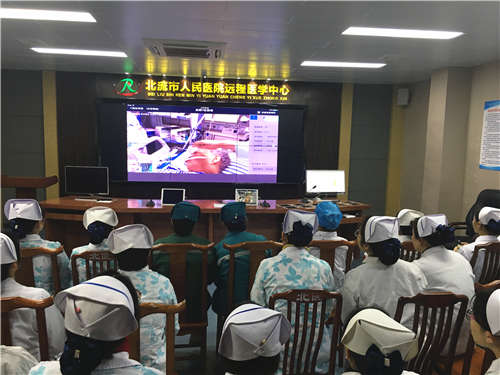 12月13日上午10时30分,在北流市人民医院远程医学中心和ICU病房,中国人民解放军空军总医院ICU戴紫巍专科护士与我院60余名医护人员的一场远程护理查房“首秀”即将开始。这是北流市人民医院首次就护理疑点、难点需求而开展的远程护理查房,首个关注的护理问题围绕着一名慢性肾脏病Ⅴ期、CPR术后患者展开。