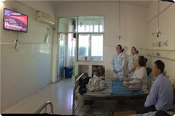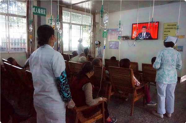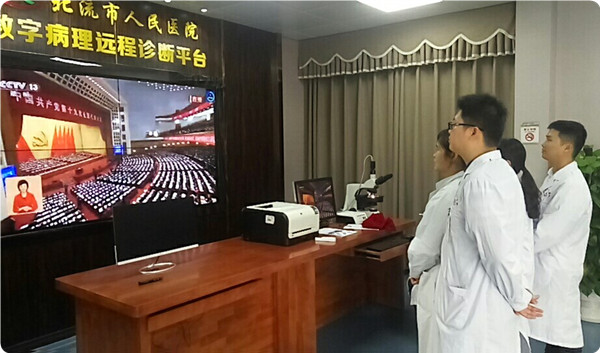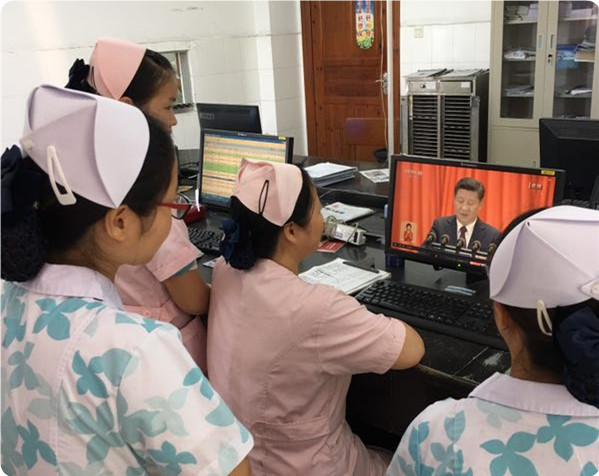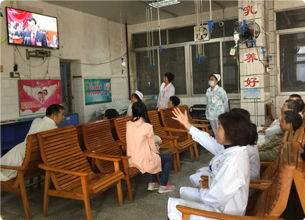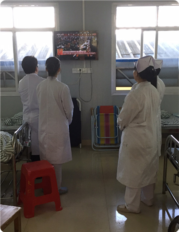 在各科室、支部,还自发组织党员干部职工以不同形式观看了直播。或在工作休息间隙集中收看,或在科室组织收看,还有的在病床前与患者、家属一同观看。虽然地点不同,但大家怀着“不忘初心跟党走,同心共庆十九大”的美好愿望。习近平总书记的报告旗帜鲜明、高屋建瓴,思想深刻,内涵丰富,字字句句吸引、鼓舞着在座的每一位观众,不时爆发出阵阵掌声,浓厚的氛围深深地感染着每个人。就如报告中提到的,“我们比历史上任何时期都更接近、更有信心和能力实现中华民族伟大复兴的目标”,我们这一代人,沐浴着前所未有的时代春风,站在国家社会发展的浪尖,更应该努力把握这难得的机遇,以更饱满的热情投身祖国伟大复兴大业中。