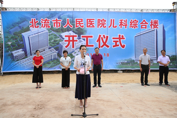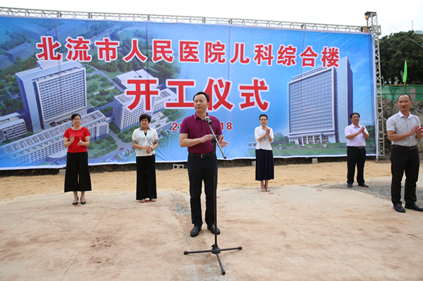 7月18日, 北流市人民医院又迎来发展史上具有里程碑意义的一大盛事,医院儿科综合大楼开工建设。北流市委常委、常务副市长莫景彪,市委常委、宣传部部长、副市长陈素贞,副市长唐传华,市人大副主任廖贤伟,市政协副主席邱雄英,市卫计委机关党委覃德军书记、杨书玲副局长,以及医院领导班子成员、中层干部、部分职工代表、儿科综合大楼施工、监理单位等代表100多人参加了开工仪式。唐传华副市长主持开工仪式。