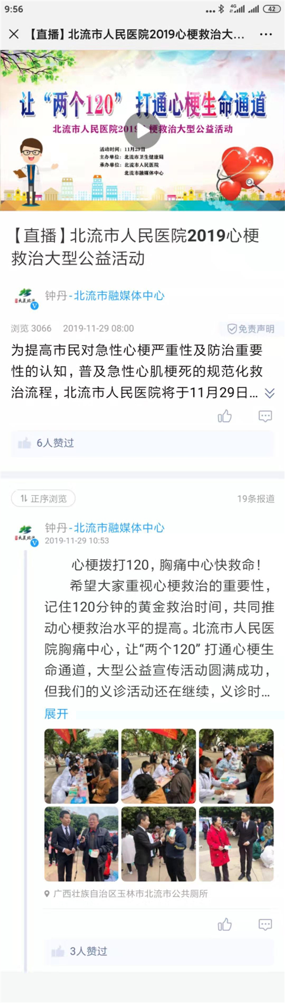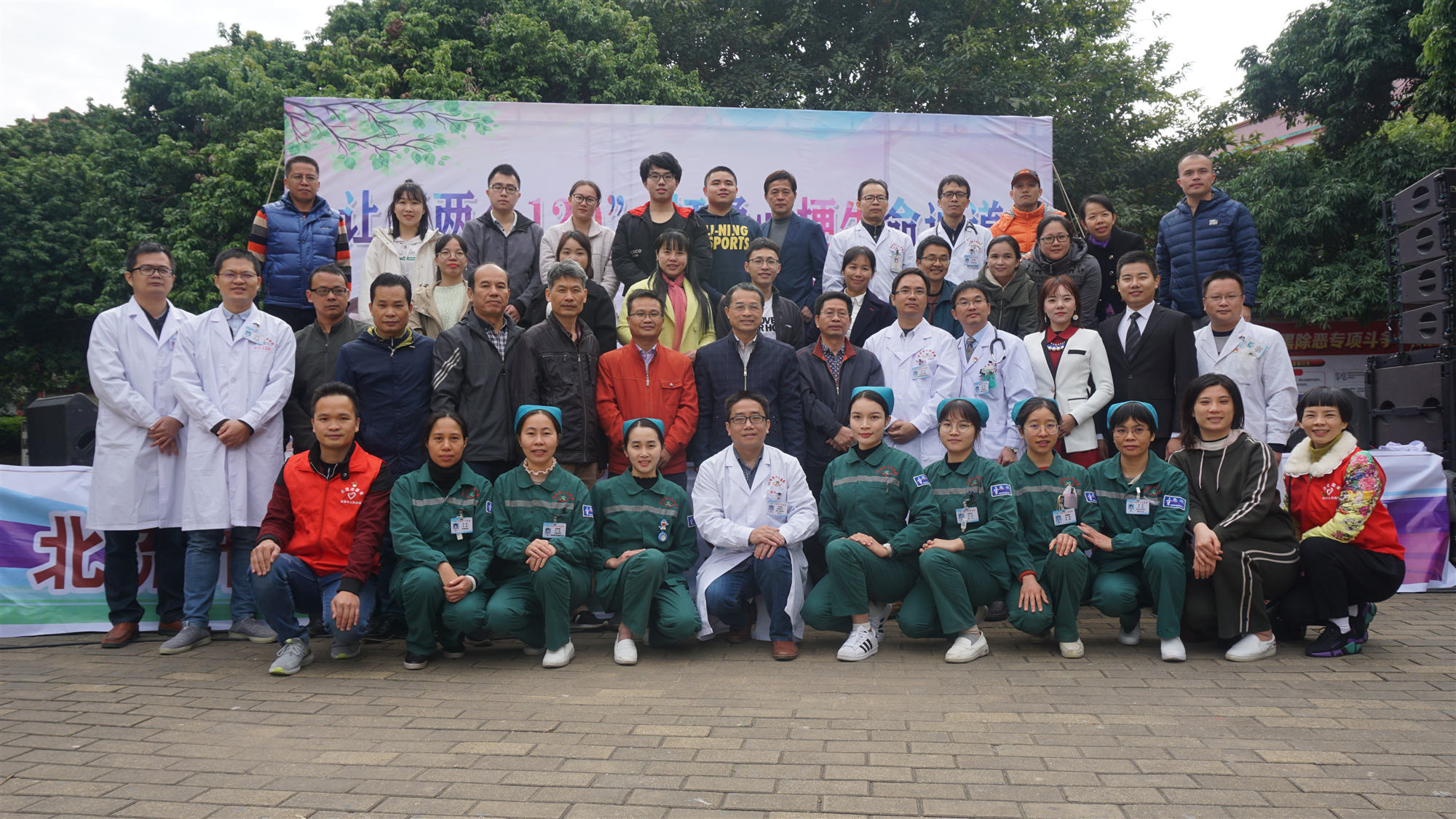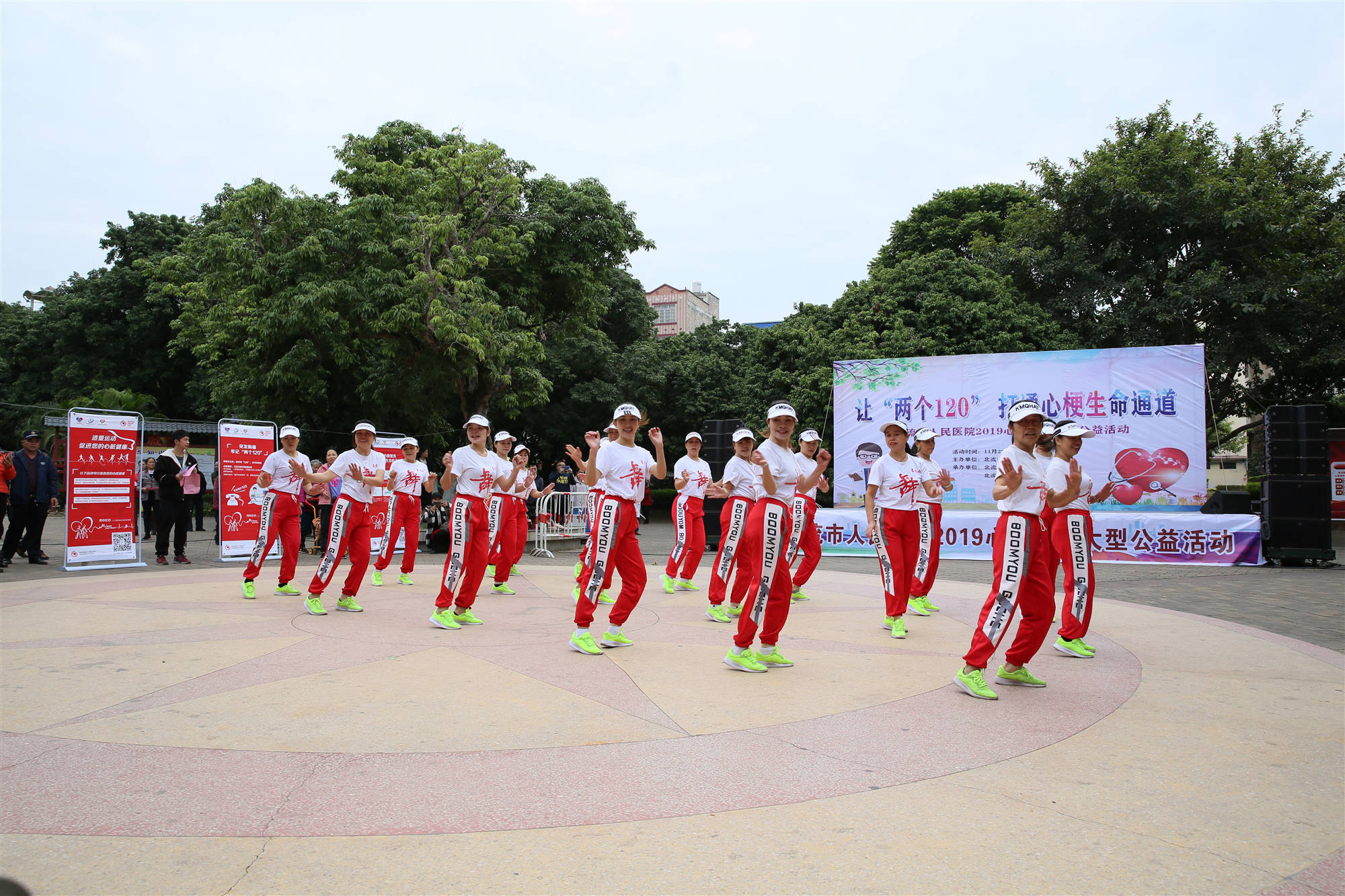 为提高公众对心梗严重性与防治重要性的认知,普及急性心肌梗死的规范化救治流程,将“心梗拨打120,胸痛中心快救命”的观念在公众中普及,倡导公众主动维护自身心血管健康,预防为主,尽可能呼吁更多人改善生活方式,包括健康饮食、积极运动、戒烟限酒等,使更多的人免受心血管疾病的困扰,焕发心脏活力,北流市人民医院联合北流市融媒体中心,于11月29日在荔枝公园举办了让“两个120”打通心梗生命通道大型公益宣传义诊活动。
