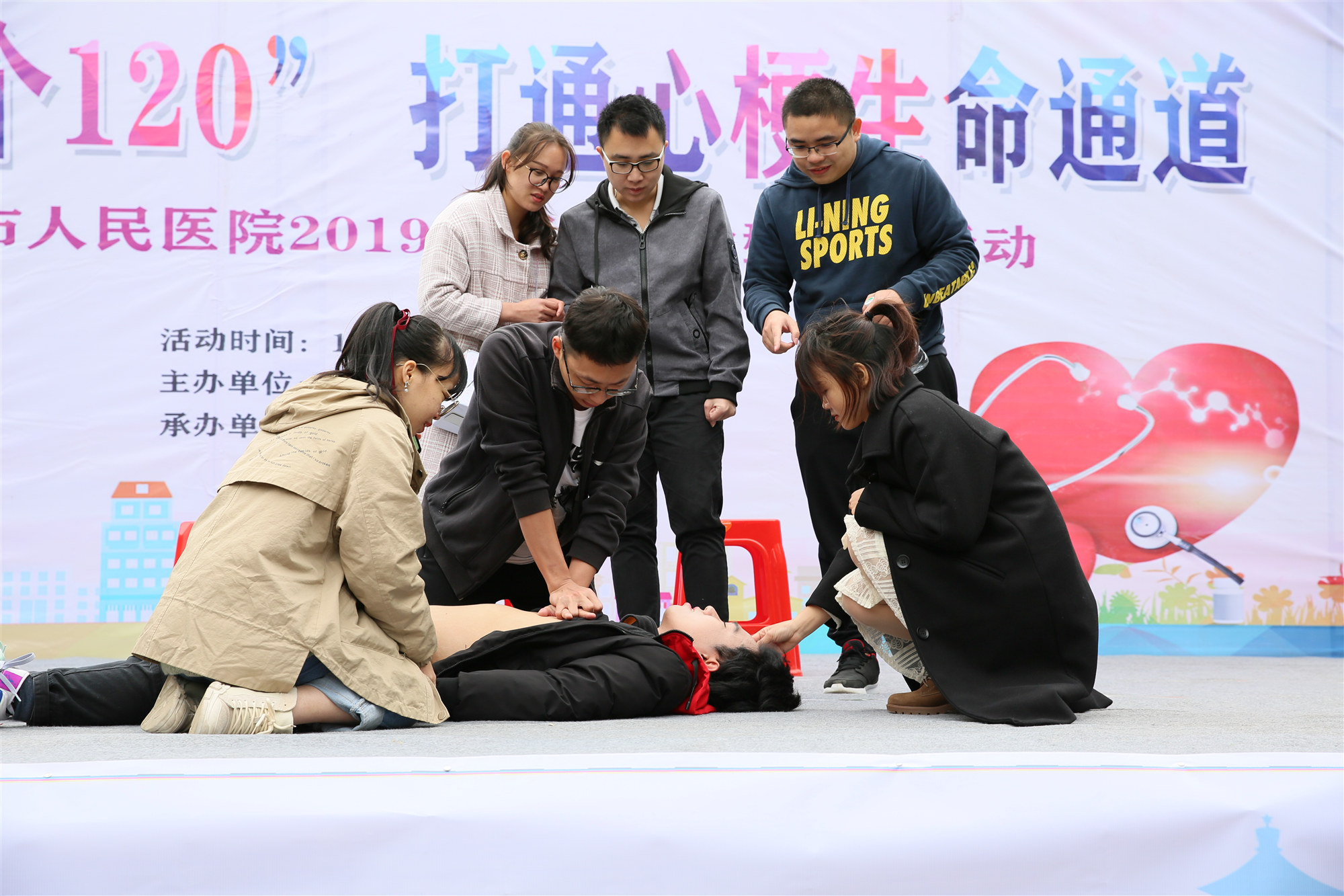 接着,以情景表演小品《痛心的包》引出突发心脏骤停抢救成功为切入点,急诊科李峻峰主任进行了现场救急演示,指出:心脏骤停是医学领域最危急的情况之一,4-6分钟后会造成患者脑和其他人体重要器官组织不可逆的损害。4分钟内进行心肺复苏,患者还有可能被救活,又称“生死时速4分钟”。其实对于普通大众来说,心肺复苏术(CPR)并不高深,掌握几个关键步骤,我们都有可能救人一命,挽救一个家庭。急救怎么做?记住,不是背起病人奔医院,而是拨打120之后马上有效规范地进行心肺复苏,掌握这黄金4分钟很关键!第一要稳:将患者移至适当的体位,要注意保护颈部,可一只手托住颈部,另一只手扶着肩部,使患者平稳转动至仰卧位。第二要快:按压胸部,位置为两个乳头连线的中间点,每分钟至少要在100次以上;按压胸部和人工呼吸的比率为30:2,即每次按压30次接着做两次人工呼吸;人工呼吸时每次吹气应持续1秒钟以上。第三要深:做胸外心脏按压时,幅度要足够深。以成人为例,按压下去要使胸骨下陷至少5厘米,以助于患者的心脏收缩和血液向全身输送。