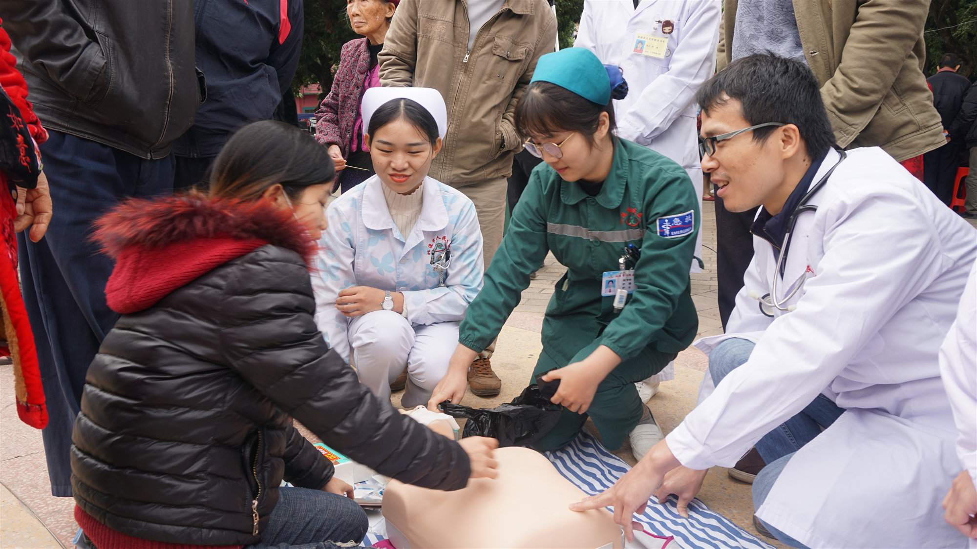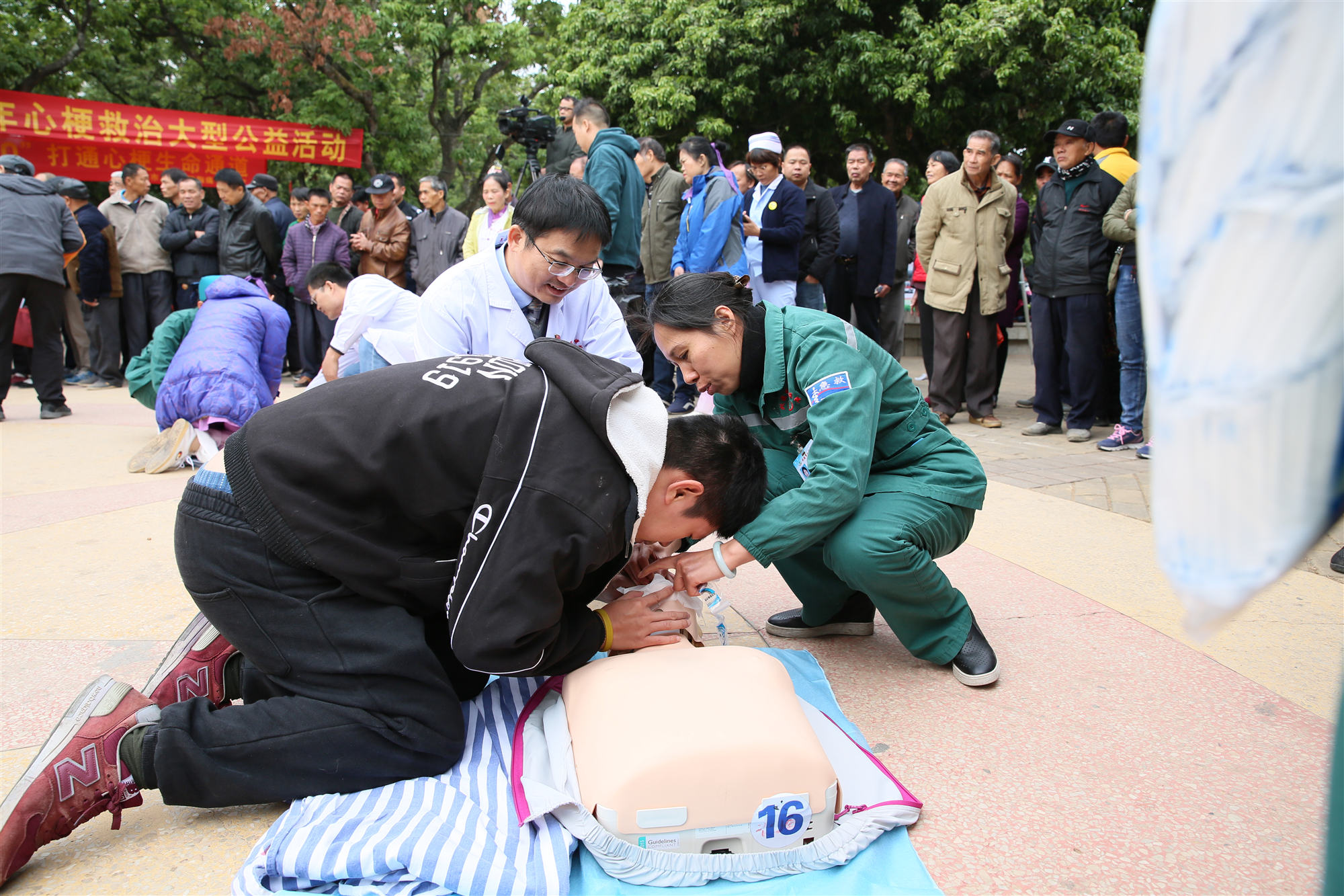 蒋靖生副院长带领专家团队进行了心肺复苏术(CPR)教学演练,现场50多位群众积极参与CPR操作,掌握了CPR的操作要点和步骤,提高了群众的急救意识和水平,亦将整个活动推向了高潮。