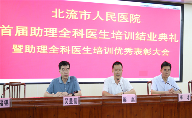 8月18日上午,北流市人民医院首届助理全科医生培训结业典礼暨助理全科医生培训优秀个人表彰大会在内科楼13楼会议室举行,结业典礼由吴显儒常务副院长主持。北流市卫生健康局副局长梁高、医院党委书记李才及医院党政领导班子成员、相关职能部门负责人、基层实践基地负责人、带教老师、教学秘书以及全体助理全科医生学员共120多人参加了结业典礼。
