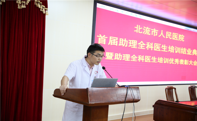 在会上,北流市卫生健康局梁高副局长为结业典礼致辞,对我院助理全科医生培训基地的工作给予了肯定和赞扬,对2018级助培学员圆满结束培训任务表示衷心的祝贺,并希望学员们勇敢接受未来的挑战,不忘初衷,坚持自己的梦想,掌握技能,刻苦专研,不断提高自身文化修养实现个人价值,成为一名优秀的基层医生。同时对我院助理全科医师规范化培训工作做出要求,要求全院上下一心,加强助理全科医生培训基地和师资队伍建设,提升临床教学能力,全力做好带教工作。