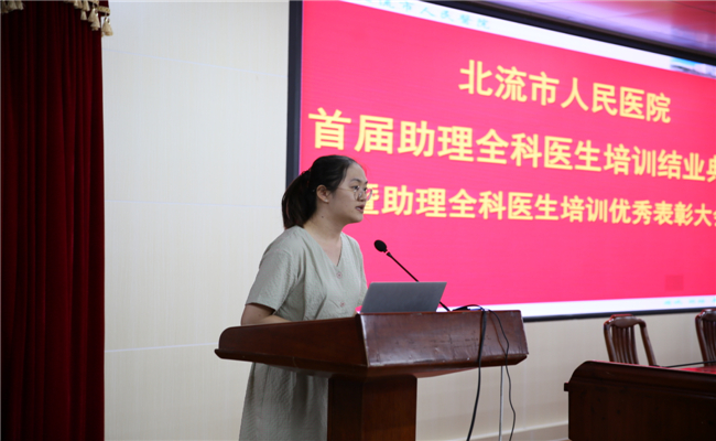 带教老师代表与学员代表分别进行发言,带教老师代表刘其毅感谢北流市人民医院搭建的平台让他做医师的同时成为了一名老师,与学员们共同成长,并鼓励学员们不惧未来,学习更多医学知识。学员代表陈丽宇对医院领导、科教科及带教老师们对学员们的关心和辛勤付出表示衷心感谢,决心牢记使命,用一颗仁爱之心去维护医学的圣洁与荣耀,做一个合格的基层百姓健康“守门人”。