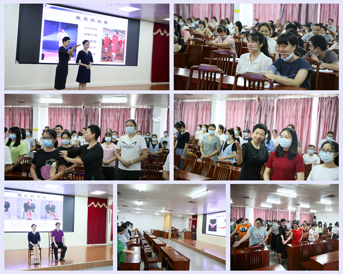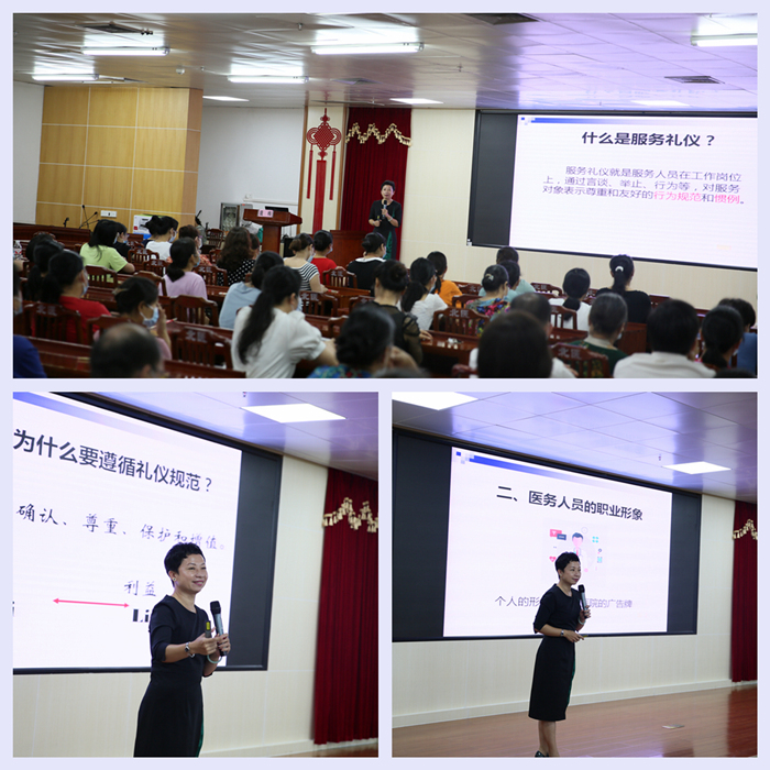 为深入开展新时代文明实践活动,助力全国文明城市创建,巩固国家卫生城市成果,进一步提高医院职工的文明素质和服务能力,培养员工讲文明、重礼仪、团结友善和热情服务的良好形象,围绕“文明健康 有你有我”主题,践行文明礼仪规范,推进文明风尚形成,提升医院的整体对外形象,自2020年6月23日至7月25日,我院特别邀请玉林师范学院音乐舞蹈学院庞梅教授在内科楼十三楼会议室分十批次为全院干部职工进行礼仪培训。