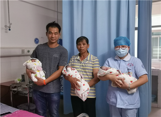 产妇全家对我院医务人员精湛的医术、优质的服务和为患者着想的工作精神充满感激之情。这一例三胞剖宫产术快速完成(仅历时1小时)体现了我院产科团队高超的医疗技术和协作精神,为北流有这样一支医疗团队点赞,更是患者一大福音。