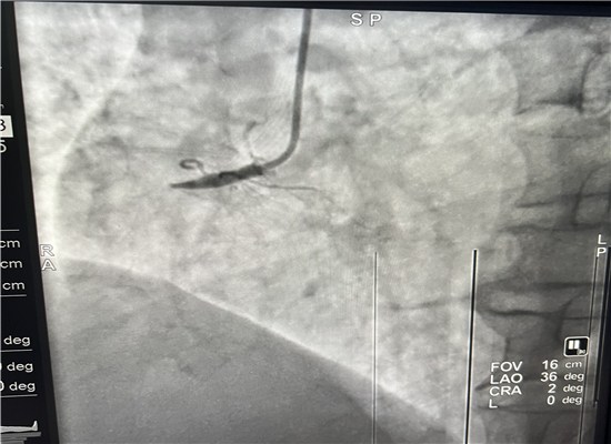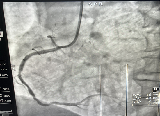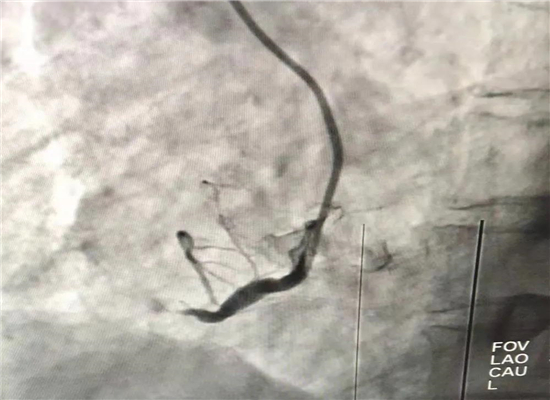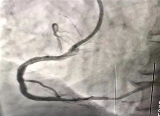 早上8时48分,120急救中心接到六麻卫生院的出诊电话,有一名胸痛病人7时左右在家晕倒,家属急送到六麻卫生院,初诊为急性心肌梗塞,病情危重,需马上转院到我院进一步治疗。急诊医学科立即启动急性心肌梗塞救治绿色通道预案,立即出车,于9时40分到达六麻卫生院,到诊后复查心电图并立即上传微信群会诊,确诊后为患者按急性心肌梗死急诊介入治疗做准备,监护返回。提前通知心血管内科医师到急诊医学科等侯会诊,并同时激活导管室。10时45分患者顺利转运回我院,心内科医师会诊后快速完成知情谈话及签字,10时57到达导管室,由杨勇、张轩两位主任进行介入手术,术中发现患者右冠状动脉100%闭塞,11时46分顺利植入一枚支架,患者的心肌得以重新灌注,11时58分手术结束,术后患者胸痛症状明显缓解,12时12分转到CCU监护。
