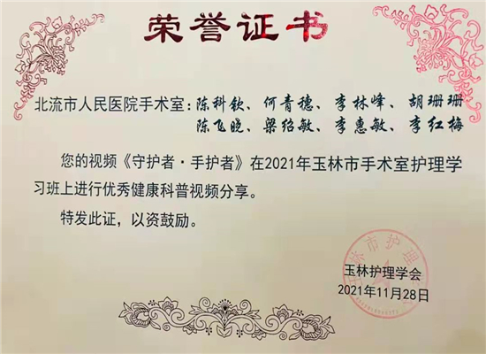 1128日,北流市人民医院手术室护理团队制作的参赛作品《守护者·手护者》在2021年玉林市手术室护理学习班上获奖啦!