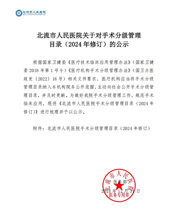 北流市人民医院手术分级管理目录(2024年修订)